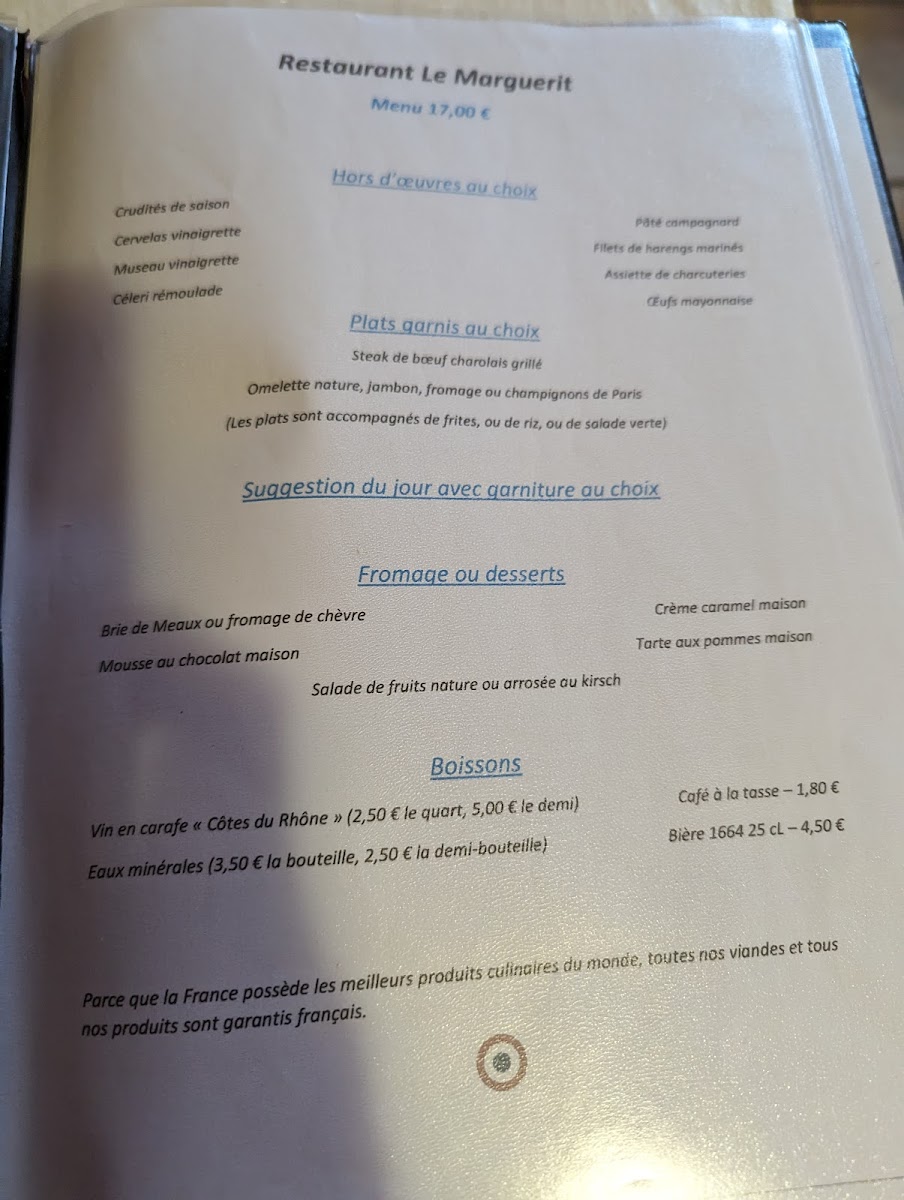 The menu at Restaurant Le Marguerit offers a delightful mix of French classics, with a few standout dishes that reflect the heart of the local culinary culture. Among the highlights are the crispy and satisfying Frites, a French take on fries that are perfect for pairing with nearly any main course or enjoying on their own. Another must-try is the refreshing Salade de Fruit, a vibrant fruit salad that provides a sweet and healthy balance to the savory dishes on the menu.