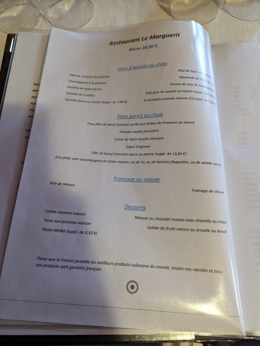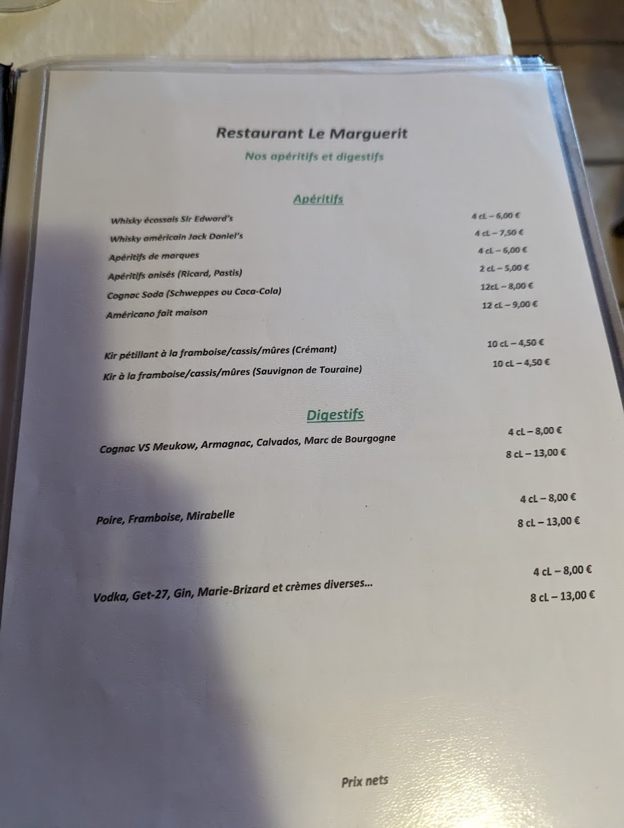 The simplicity of these dishes, yet their ability to capture the essence of French flavors, makes them a perfect representation of what Le Marguerit has to offer. Whether you're looking for something light and fresh or a comforting side to a more substantial dish, the Frites and Salade de Fruit are guaranteed to please. The menu keeps things approachable while still showcasing the quality ingredients and culinary skill that make this restaurant a standout in Gretz-Armainvilliers.